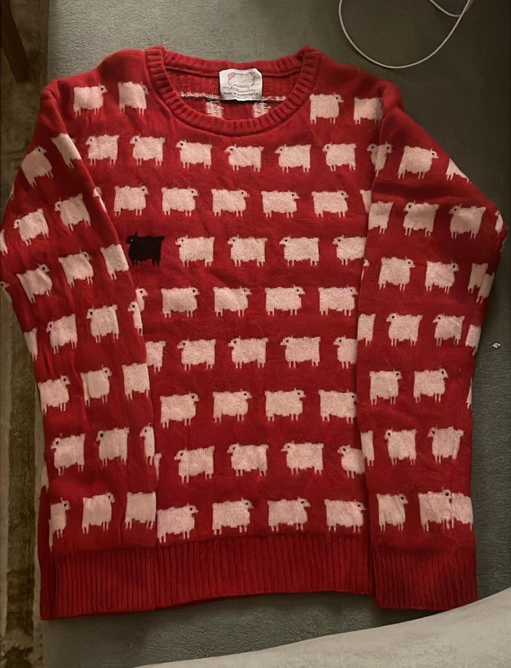 Thrifted this “Warm and Wonderful” Diana edition sheep sweater for less than $2.