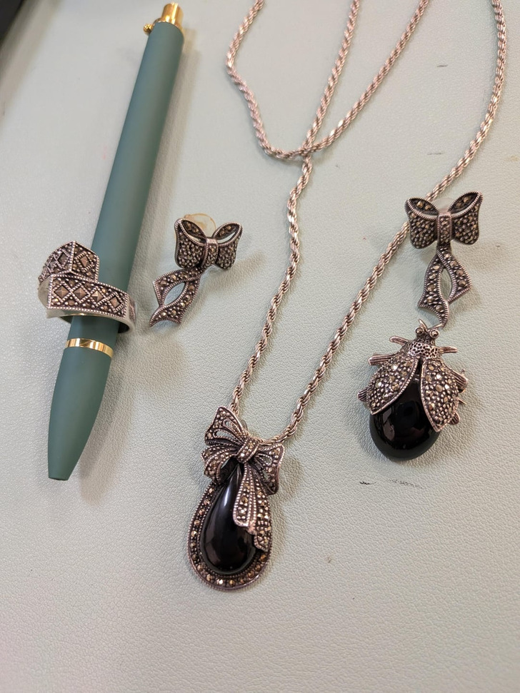 The jewelry I wore today, 100% thrifted. Sterling, marcasite and onyx.