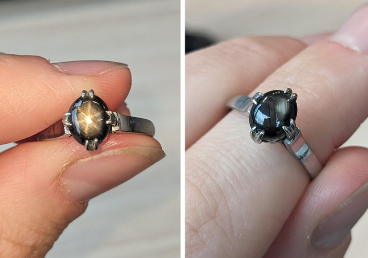 I just picked this up on a whim at my local thrift store for very cheap, the setting is a bit high but I liked the look of the stone. The rays in the stone are only visible with a strong light, and shift around if you move the light source.