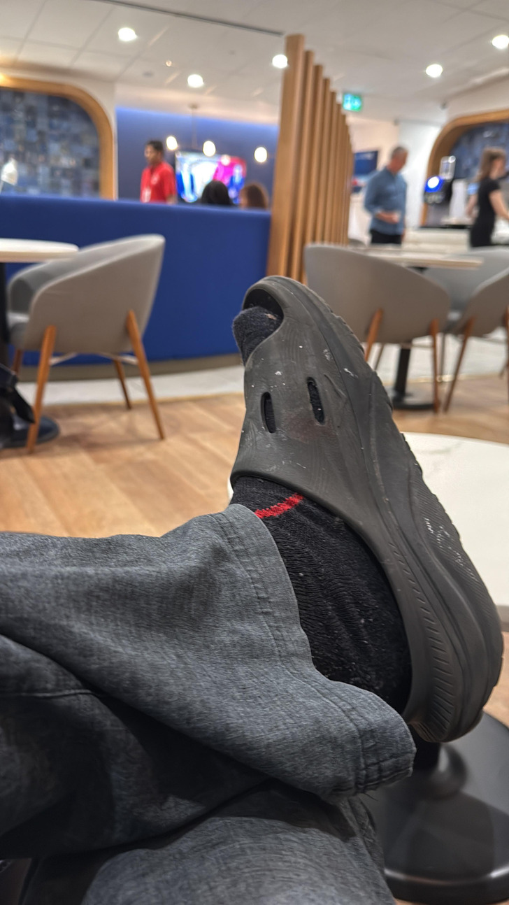I’m sitting at the airport before my flight and realize I forgot something important — to put on shoes.