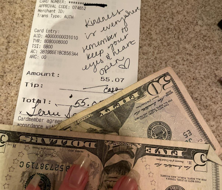 - Was having a really bad night at work, customers were being SUPER rude. This woman left me a 100% tip, and wrote me the sweetest thing that turned my night right around. She wrote, “Kindness is everywhere, remember to keep your eyes and heart open.” © sophmca / Reddit