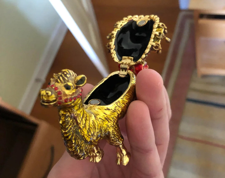 I arrived home, placed it on the shelf, and later my cat broke it. I started gathering the pieces and found earrings inside. I text him, “Why didn’t you tell me there was a gift inside?”