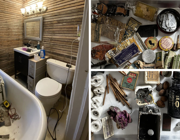 We live in a house built in 1915. We decided to renovate the bathroom and discovered real treasures behind the wall — a bunch of old toiletries!