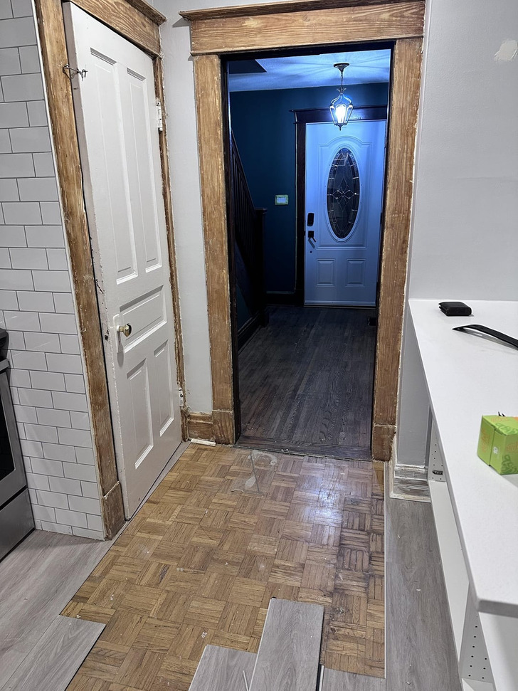 We recently bought a 100-year-old house. After removing 2 layers of horrible laminate, I discovered different flooring underneath. Here’s what awaited us in the kitchen!