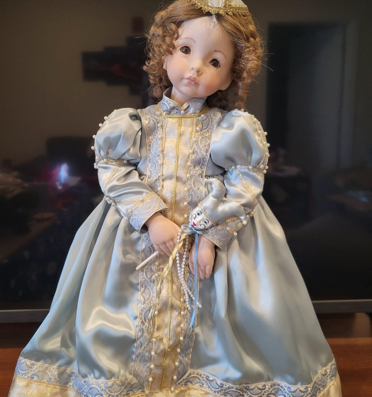 I want to show one of the things crafted by my grandmother’s hands. She made this doll from scratch: she cast the molds for the face and hands herself, painted them, sewed the dress, and crafted the hat and mask.