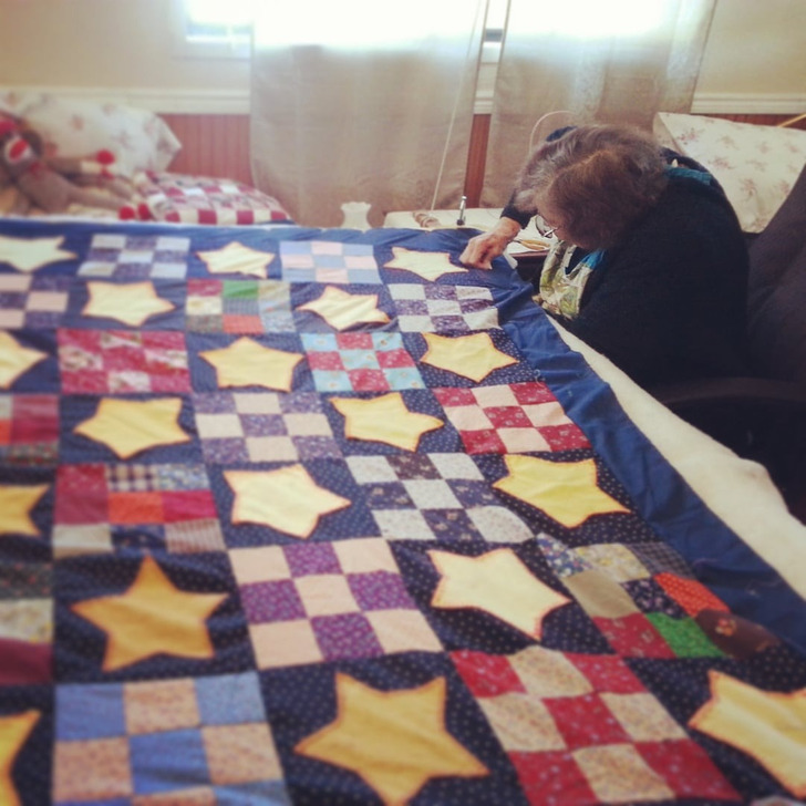 Grandma proudly shows off the patchwork quilt she made for my little sister’s birthday.