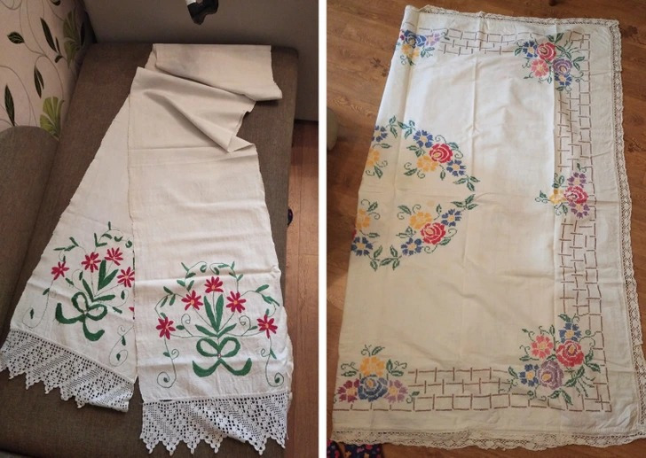 My mom recently passed away, and in memory of her, I took this tablecloth from my parents’ home. It is a little over 60 years old. In the late 1950s, my grandmother, mother, and aunt worked on it.