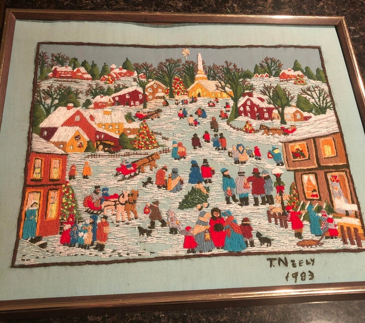 My grandmother made this Christmas scene entirely of yarn. I think it looks cool.