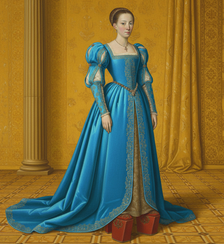Chopines were usually made from wood or cork and covered with luxurious materials like leather, brocade, or jewel-embroidered velvet, sometimes matching the wearer’s outfit. Wearing them could be tricky; some women needed two servants to walk safely, though experienced wearers could move gracefully and even dance.