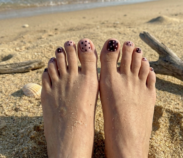 Dusty rose and polka dots are a major highlight of the 2026 “earthy minimalist” trend, offering a soft yet striking contrast that feels grounded in nature. This style features a muted, sun-kissed pink base paired with rich, chocolatey accents to create a warm look that is both playful and incredibly polished. It replaces traditional brights with a more sophisticated palette that complements the natural beach aesthetic while still making a clear style statement.