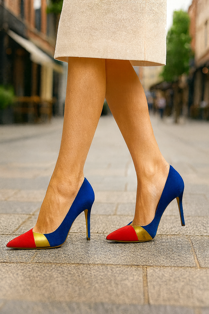 Red-and-blue pointed-toe heels are bold, but when styled with a beige skirt, they clash instead of complementing, making the outfit look mismatched. Instead of elevating the look, the shoes become distracting.