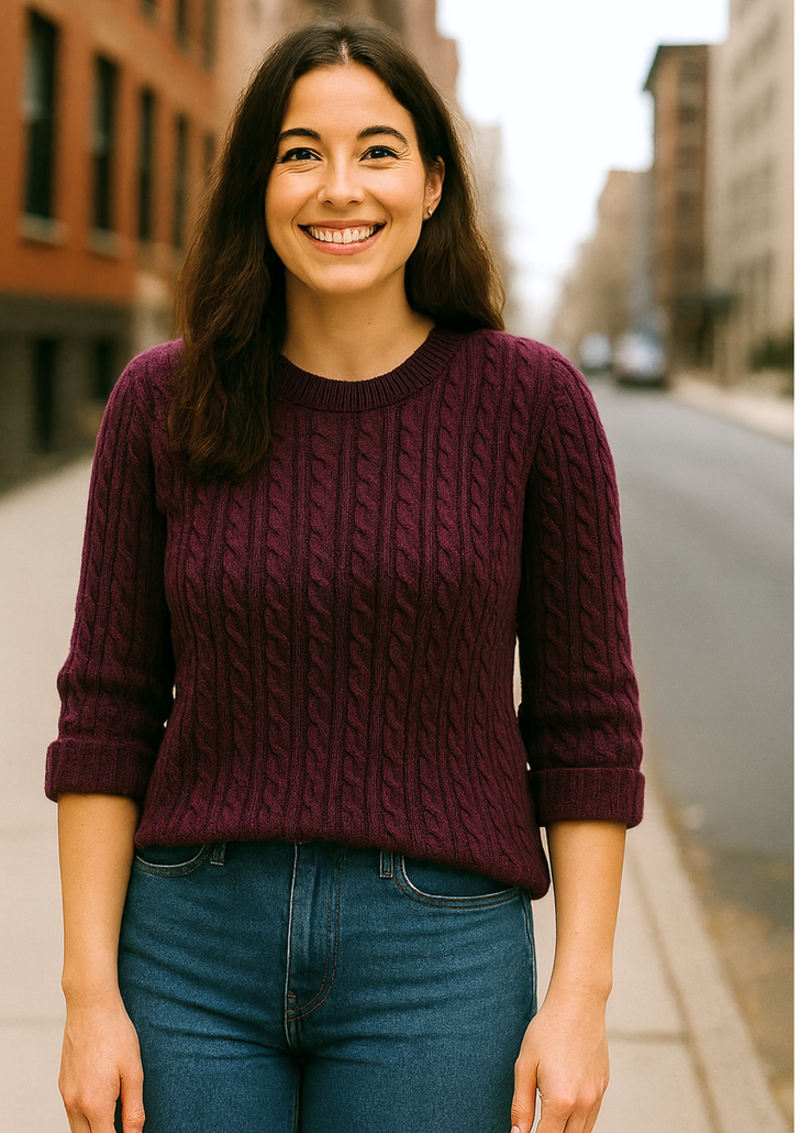 The deep plum sweater here is chic, but the 3/4 sleeves paired with the bulky knit make the proportions feel a bit “off.” Ill-fitting or oddly cropped sweaters can unintentionally downgrade a look, even if the color is gorgeous.