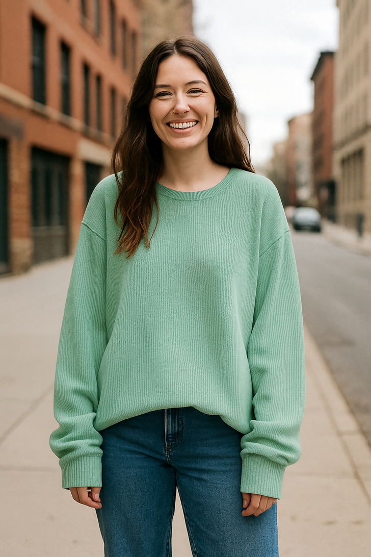 Wearing an oversized sweater can look chic, but if it’s not styled correctly, it can easily make your outfit look shapeless and cheap. In this look, the slouchy mint-green sweater overwhelms the frame, hiding the waist and giving off a too-casual vibe.