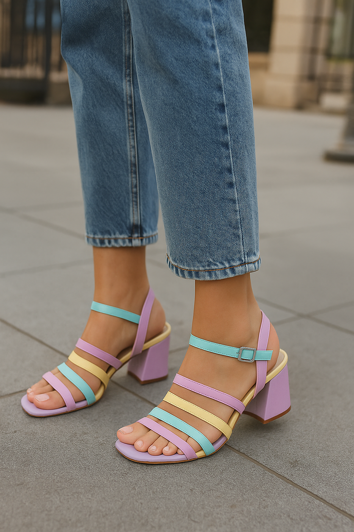 Pastel block heel sandals in multiple colors can look fun, but when paired with casual jeans, the outfit often loses sophistication and looks cheaper. The playful mix of pink, yellow, and turquoise is too busy against relaxed denim.