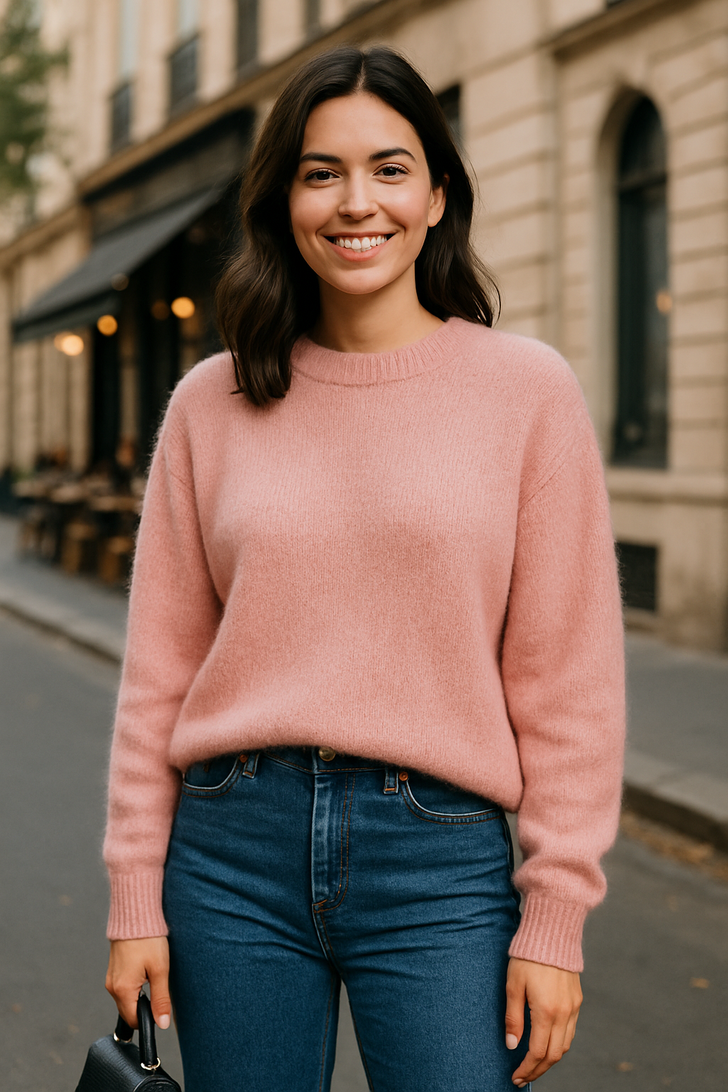 A soft blush sweater is timeless, but when paired with plain jeans and minimal styling, it risks looking overly basic, and basics without contrast often come across as cheap rather than effortlessly chic.