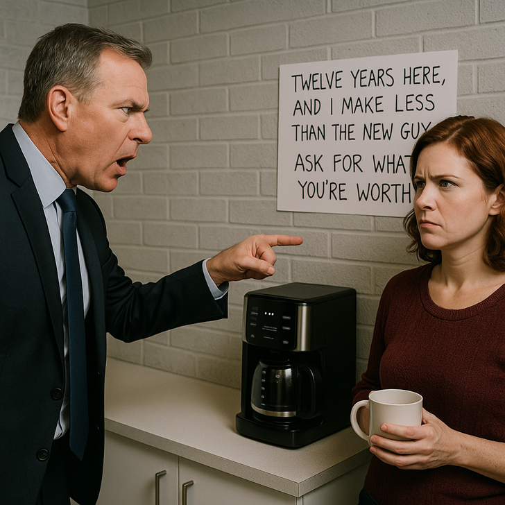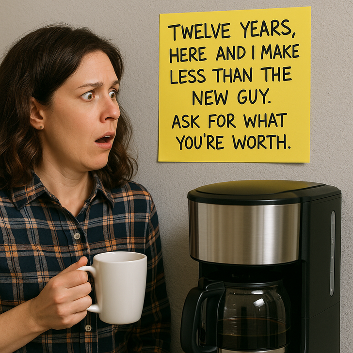 I didn’t go to HR. I didn’t write an email. The next morning, I made a sign and posted it above the coffee machine—the heart of the office crowd. ‘Twelve years here, and I make less than the new guy. Ask for what you’re worth.’
