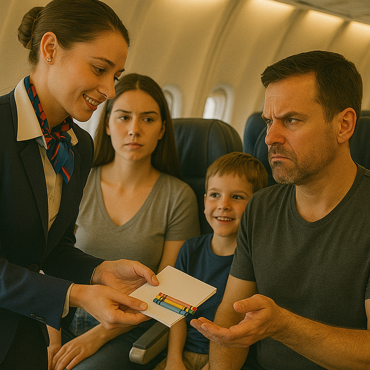 She stopped by Derek, handed it to him, and said cheerfully, ’Here you go, sir. This should help keep your son entertained so he doesn’t get distracted by other screens.’ The look on his face was priceless. His son was thrilled, already opening crayons and stickers, while Derek awkwardly paused his movie.
