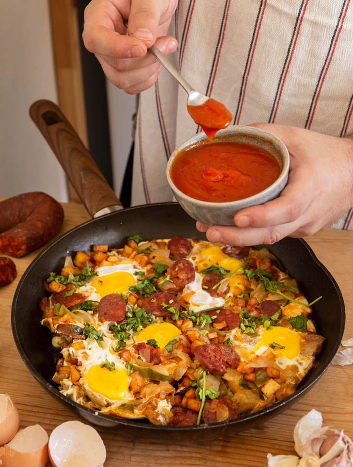 - Make small wells in the potatoes and crack the eggs into them. Cover and cook for 5–7 minutes, until the eggs are done to your liking.