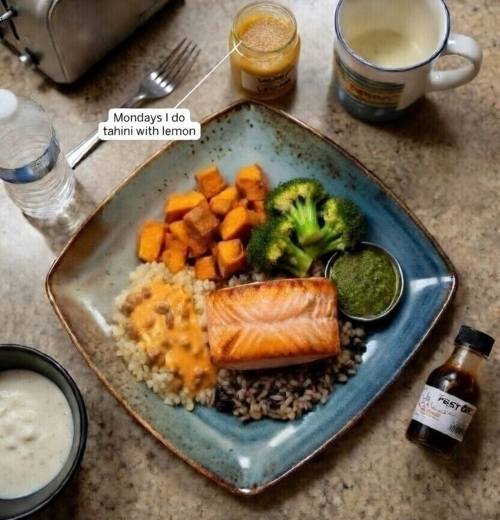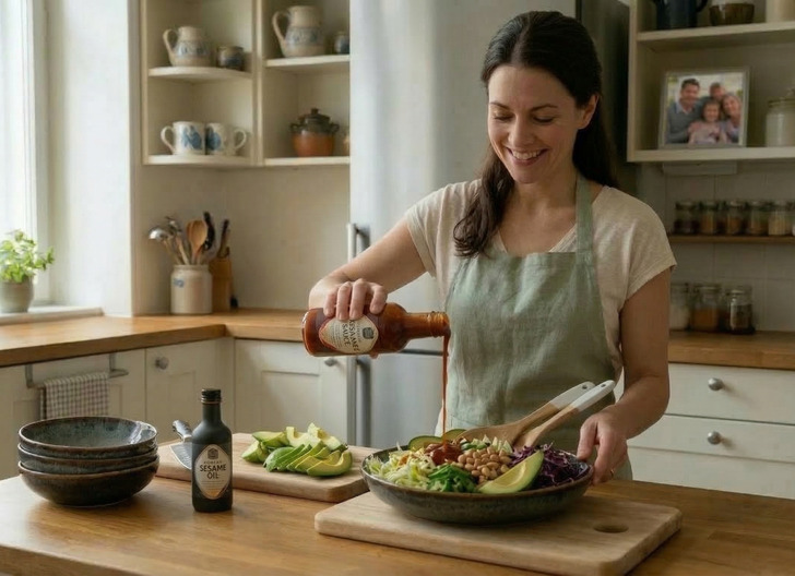 This was the single most important thing I figured out — and nobody talks about it. The same bowl of farro and roasted broccoli tastes like four completely different dinners depending on what you put on it. Your family won’t notice the ingredients are the same. They’ll only notice the flavor — and if the flavor changes, dinner feels different.