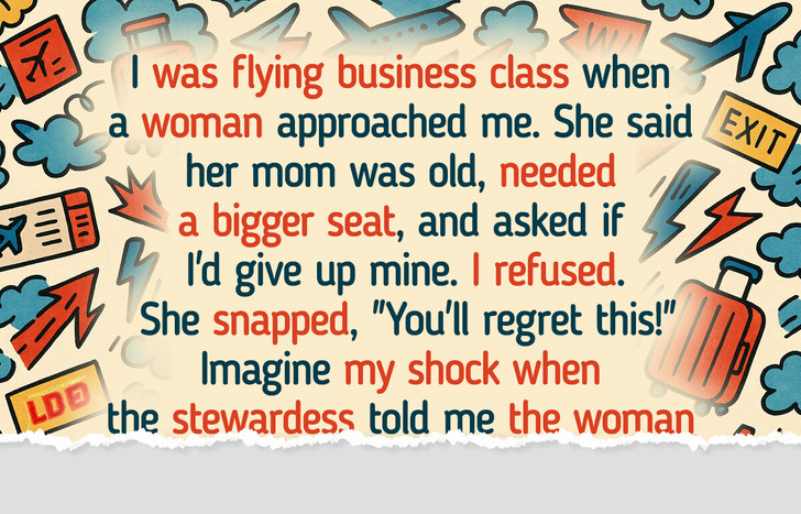 So I was on a long-haul flight recently, sitting pretty comfy in business class, first time I’ve splurged like that, honestly. About 20 minutes after boarding, this woman comes up to me and asks if I could give up my seat for her “elderly mom” because she “needs more space,” like a bigger seat.
