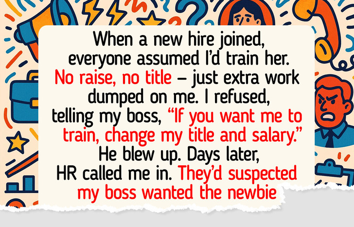 Two days later, HR called me in. My stomach dropped — I thought I was getting written up. Instead, they wanted details. Turns out, complaints about my boss had been stacking up, and my refusal to train was the last straw that made them dig deeper. They suspected my boss wanted to replace me with the newbie.