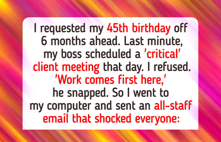 I booked my 45th birthday off six months ahead of time and got written approval from my boss. Last minute, he scheduled an “urgent” client meeting that day and expected me to cancel my plans. I refused, citing my pre-approved time off and family plans that couldn’t be moved. “Work comes first here,” he said coldly.