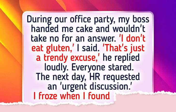 My boss brought a cake to celebrate our biggest client win of the year. When I politely declined a slice, he asked why in front of the entire team. “I don’t eat gluten,” I explained simply.
