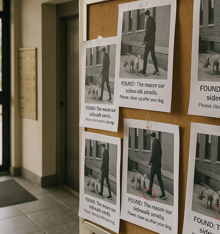 So I took screenshots, printed dozens, and taped them everywhere: the lobby, mailboxes, elevator, front gate, even the community “Lost & Found” board. Each one said: “FOUND: The reason our sidewalk smells. Please clean up after your dog.”