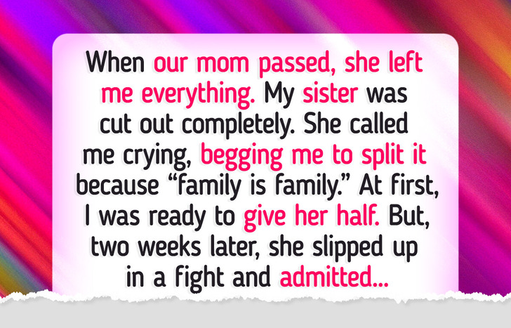 At first, I was ready to give her half. Then, two weeks later, she slipped up in a fight and admitted something: she already got her share years ago. Mom gave her a huge sum privately when she bailed her out of debt. That money? She blew it in less than six months.
